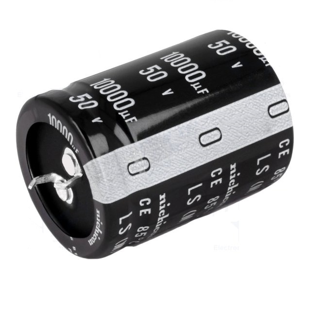 Manufacturer NICHICON Type of capacitor electrolytic low ESR Mounting THT Capacitance 10000uF Operating voltage 50V DC Body dimensions 30 x 40mm Tolerance 20% Leads snap-in Service life 3000h Operating temperature -40…85C Max. operating current 5.08A Leakage current 2.12mA