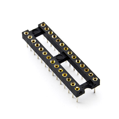Type of integrated circuit socket DIP Number of pins 28 Row pitch 7.62mm Contact plating gold plated Body material polyester Max. contact resistance: 3mO Flammability rating UL94V-0 Pin diameter 0.51mm Maximum current 1A Electrical mounting THT Terminal pitch 2.54mm