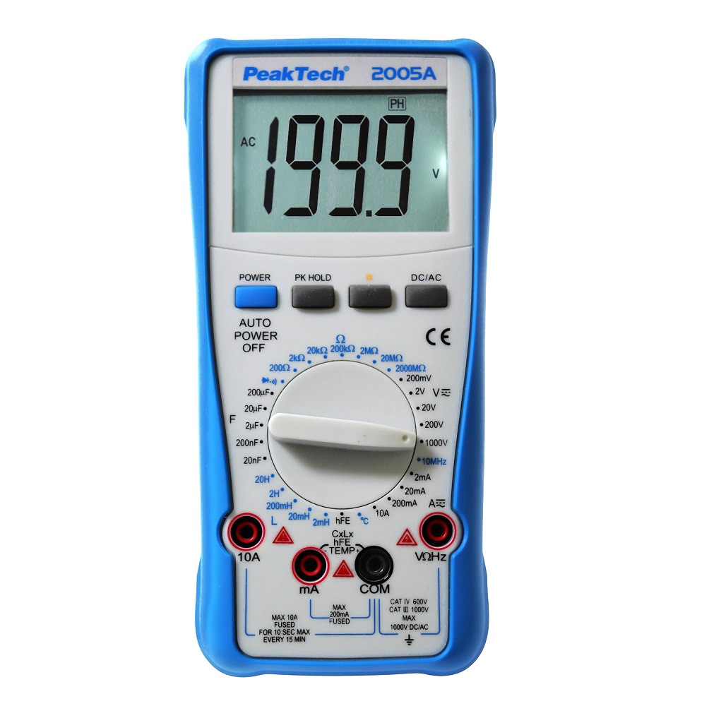 Digitalni univerzalni instrument Peak Tech, Unimer, Struja AC: 2/20/200mA/20A Struja DC: 2/20/200mA/10A Napon AC: 200mV/2/20/200/750V Napon DC: 0.2V/2/20/200/ 1000V Frekv.: 2/20/200/2000kHz/10MHz R: 200R/2k/20/200k/2/20/2000M C: 20/200nF/2/20/200uF Ind: 2mH/20mH/200mH/2H/20H Temp.: -20 do +1000C hFE, DiodeTest