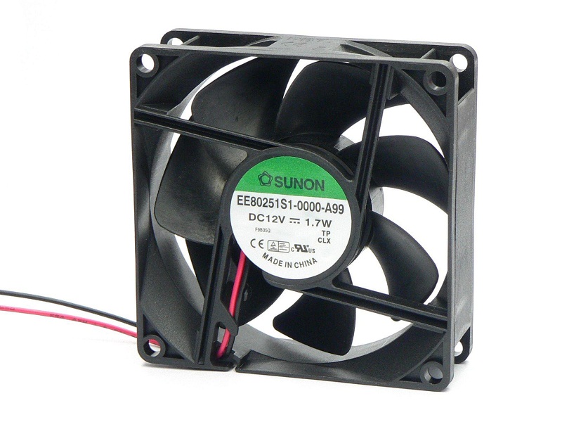 Manufacturer SUNON Type of fan DC Kind of fan axial Supply voltage 12V DC Fan dimensions 80x80x25mm Power consumption 1.66W Current rating 0.12A Fan efficiency 69.29m3/h Noise level 33dBA Kind of Bearing slide bearing
